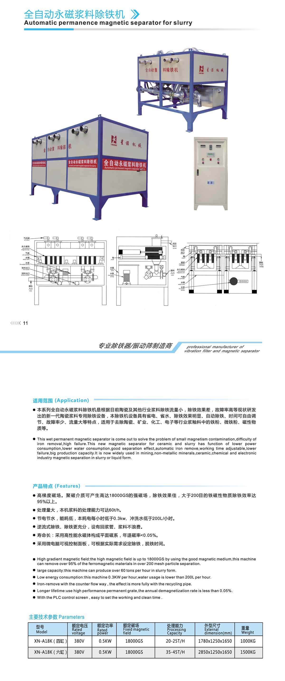 ·High gradient magnetic field:the high magnetic field is up to 18000GS by using the good magnetic medium,this machine can remove over 95% of the ferromagnetism materials in over 200 mesh particle separation. ·large capacity:this machine can produce over 60 tons per hour in slurry form. ·Low energy consumption:this machine 0.3KW per hour,water usage is lower than 200ML per hour. ·Iron-remove with the counter flow way , the effect is more fully with the recycling pipe. ·Longer lifetime:use high performance permanent grate,the annual demagnetization rate is elss than 0.05%. With the PLC control screen , easy to set the working and clean time . |